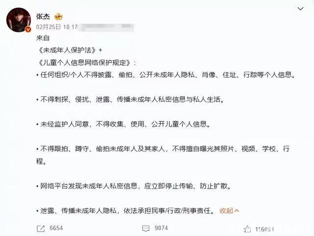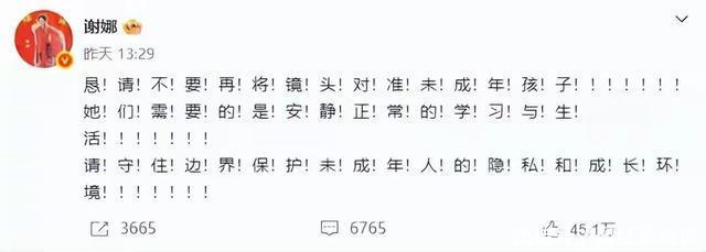 保护未成年人是底线。 女子本弱,为母则刚,这句话用在明星身上同样适用。 不管他们在娱乐圈被浸染了多久,但凡威胁到自己孩子的事情,那是绝不容忍的。 2月25日的时候,谢娜原本只是带着自己的双胞胎女儿去培训机构上课, 没想到却曝光了行程,被狗仔全程跟拍并且在网上放出照片。 只是把孩子的面部打了码,但是曝光了他们的行程和上课地点,穿搭等细节。 虽然没有直接曝光孩子的正脸,但是这些信息也已经暴露了可识别特征。 因此话题迅速登上热搜,对于这种事情,谢娜绝对是零容忍的。 当天下午她就在公共社交平台上,连发三段文字几十个字的一段话,她竟然用了68个感叹号来分隔。 足以看出她在打出这段文字的时候有多么愤怒,明星也是人,尤其是他们的孩子,更是一个普通人。 他们也应该有正常的学习生活环境,而不是不断的被打扰。 谢娜开团,她的丈夫张杰秒跟,很快就发声表示“偷拍曝光未成年人隐私。行程属于违法行为”, 而且还引用了《未成年人保护法》和《儿童个人信息网络保护规定》,直接从法律层面强化维权力度。 对于他们夫妻俩的反应,大多数网友还是支持的比较理智的。 毕竟孩子不是明星,应该有安静成长的权利,不能因为他们的父母是明星就剥夺他应有的权利,一切规则都不能驾临于法律之上。 他们夫妻俩在保护孩子隐私这方面一直都做得很好,从来都不公开女儿的正脸,就算社交平台也只发背影,侧影或者局部。 尤其是两个双胞胎女儿,长期是同款发型,同款穿搭,这样可以有效降低单个孩子被识别聚焦的风险。 也从来不带孩子上综艺,不主动谈孩子的细节,就是不想让孩子成为流量工具。 让她们有一个幸福快乐的童年,让孩子的生活简单一点。 在做妈妈这方面,谢娜确实是一个非常称职的好妈妈,她给孩子提供了非常高质量的陪伴。 尤其是1~6岁这一段关键时刻,她主动减少工作,全身心地投入家庭,就是不想错过孩子的成长瞬间。 甚至在女儿生日的前一个月,就会给她们筹备惊喜,因为她觉得让孩子快乐就是她最大的幸福。 而且还每天坚持接送孩子上学陪读,在育儿方面也讲究科学育儿。 尤其是孩子不开心,心情低落的时候,她会尽可能的疏导孩子的负面情绪,用孩子能听懂的语言让她开心起来。 而且她和孩子沟通的时候,并没有高高在上的感觉,而是平等沟通。 给三个孩子提供的吃穿住行也都是同水平的,主打一个公平育儿,不偏向任何一个。 但是在给她们报兴趣班、学特长的时候,又是因材施教。 比如跳跳喜欢讲故事,俏俏又很有音乐天赋,她也不会搞一刀切,让所有孩子都学一样的。 要说起狗仔拍明星孩子的这些事,这当然不是第一次发生,她的好朋友赵丽颖的孩子也被偷拍过。 事情发生在2025年9月份的时候,孩子被偷拍之后,赵丽颖以母亲的身份发微博, 主打一个先礼后兵,呼吁保护尊重未成年人隐私。 之后她的工作室也明确表示,偷拍未成年人是违法的,直接把个人呼吁转为法律维权的警告。 希望国家对这种事情重视起来,加大狗仔、私生饭等违法行为的管控力度。